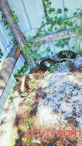 蟒蛇一口吞3只母鸡吃撑瘫路边 厦门市民“扶”起求助
