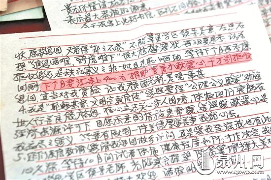 泉州网5月14日讯(记者 陈玲红 吴嘉晓 文/图)“汇寄上400元捐助学区育才献爱心,要求学区领导赏脸笑纳,千万不可拒收退回。”近日,南安市九都中心小学校长李仕良再度翻开这36封手写书 信,他总会为字里行间的拳拳之心所动容。写信的是1982年退休的老教师黄韩林,今年他已经95岁高龄。