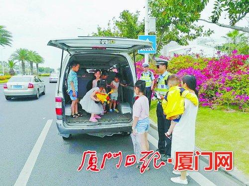 厦门一辆7座面包车足足挤了16人 后车厢全是小孩
