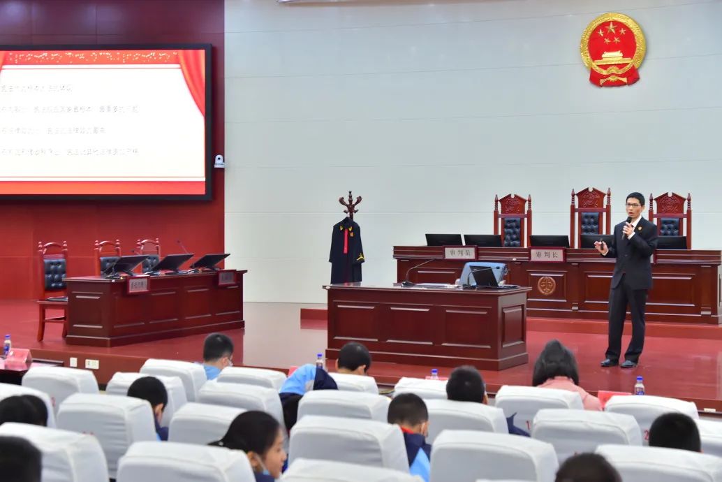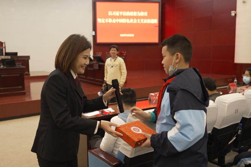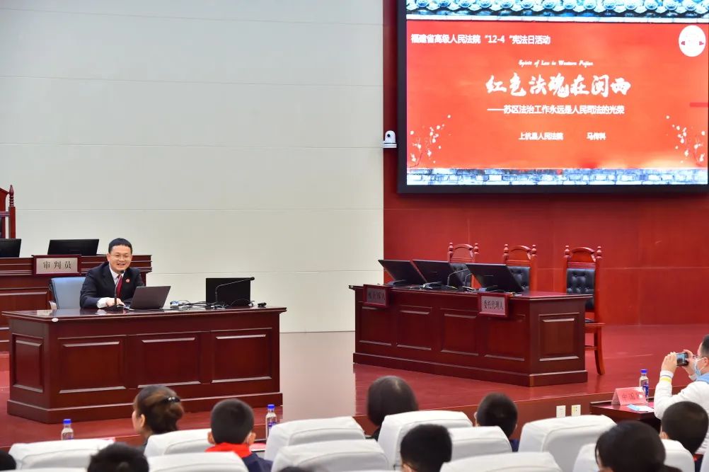 在随后开展的“一切为了人民——传承红色法治基因”专题活动中,应邀人员一同观看《共和国法治从这里走来》宣传片。共和国法治摇篮展览馆宣讲员、上杭县人民法院副院长马传科以“红色法魂在闽西——苏区法治工作永远是人民司法的光荣”为题,为大家精彩讲述了闽西红色法治建设进程;福建高院行政庭四级高级法官赖峨州为大家生动介绍了我国宪法制定与发展历程以及人民法院组织机构、审判职能、审判流程等相关知识。在宪法知识问答环节,同学们争先举手、踊跃回答,并领取了精美的“小法槌”纪念品。