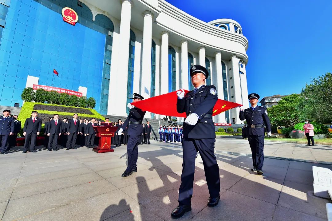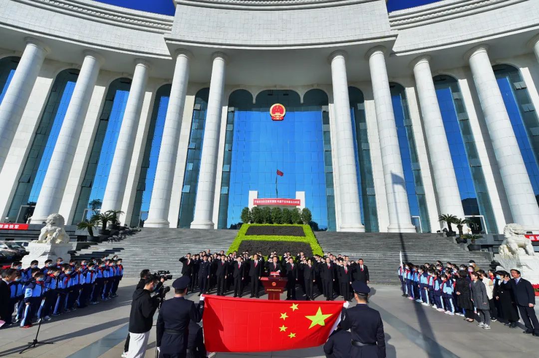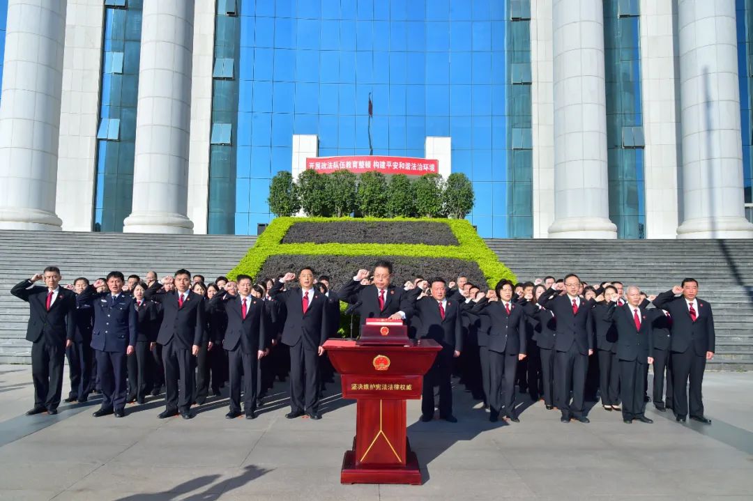 上午9时许,宪法宣誓活动拉开帷幕。法警护卫着国旗缓缓入场,全场肃立。全体宣誓人面向国旗,举起右拳,庄严宣誓:“我宣誓:忠于中华人民共和国宪法,维护宪法权威,履行法定职责,忠于祖国、忠于人民,恪尽职守、廉洁奉公,接受人民监督,为建设富强民主文明和谐美丽的社会主义现代化强国努力奋斗!”